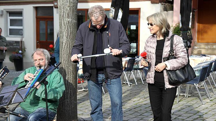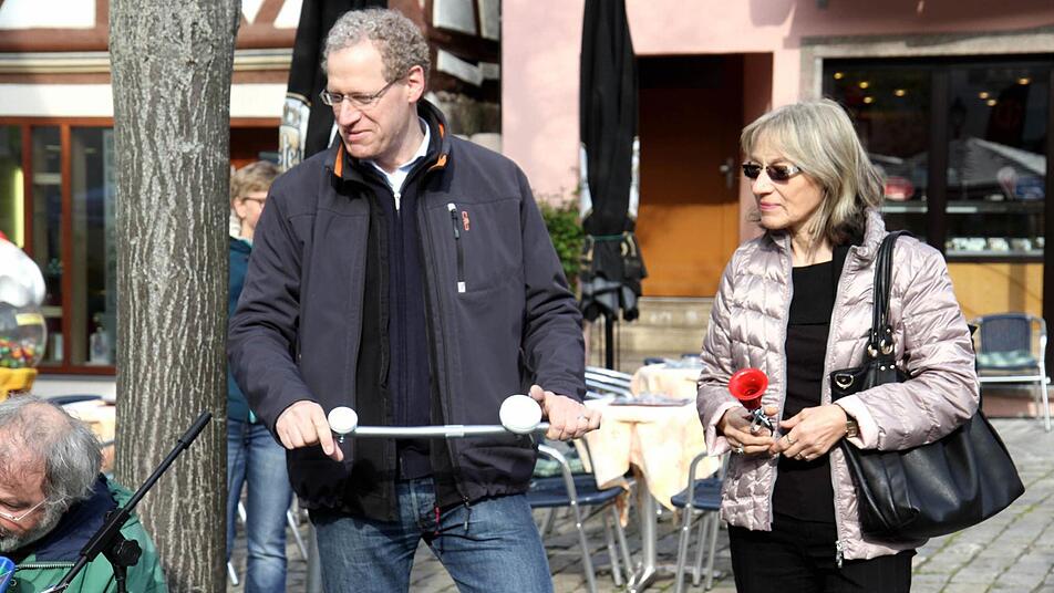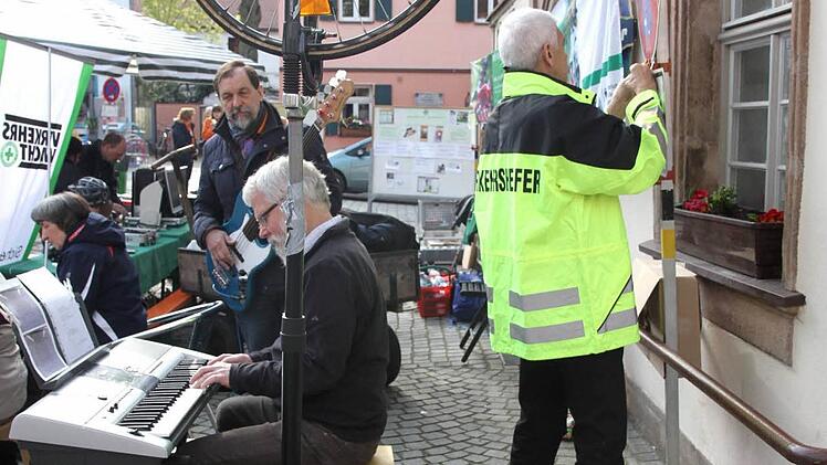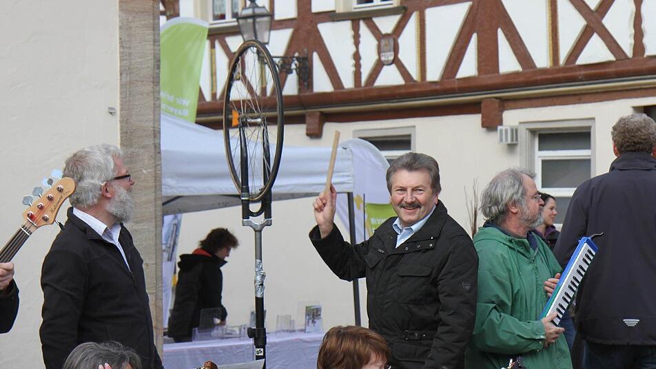 Zum Auftakt der siebten Fahrradmesse betätigte Bürgermeister German Hacker die "Herzo-Fahrradklingeln", seine Stellvertreterin Renate Schroff (beide SPD) eine Hube und der CSU-Fraktionsvorsitzende Bernhard Schwab drehte am Rad. Die drei Kommunalpoltiker waren von Martin Lauer dazu verdonnert worden, seine Combo bei "Ja, mir san mit'm Radl da" rhythmisch zu unterstützen. "Aufsteigen" hieß es am Samstag in der Innenstadt.