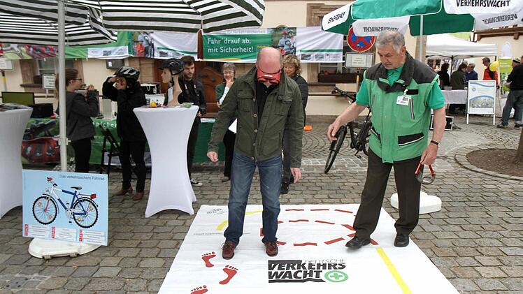 Wie es ist, wenn sich Radfahrer alkoholisiert aufs Rad setzen, konnte am Stand der Gebietsverkehrswacht ausprobiert werden. Es gab dort zwar keinen Alkohol, Rolf Weber stand aber mit Rauschbrillen bereit und führte "seine Opfer" über einen Parcours. Ihm kam dabei Stephan Wirth ganz gelegen und der CSU-Stadtrat sprach von einer interessanten Erfahrung, als er krampfhaft versuchte, mit dieser Brille der aufgezeichneten Linie zu folgen.