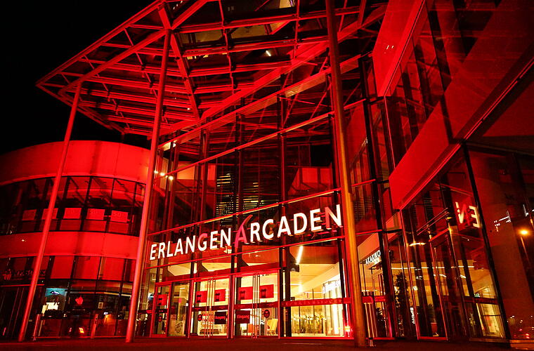 Wegen des Lockdowns sind in den Erlanger Arcaden die meisten Geschäfte seit vielen Wochen dicht. Um auf die "existenzbedrohende Situation" der Händler hinzuweisen, erstrahlte das Einkaufszentrum in rotem Licht.