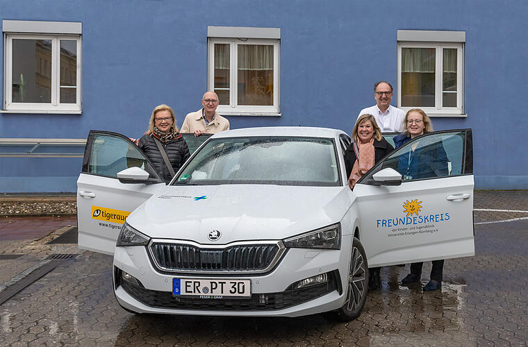 Zwei Vereine spendeten dem Kinderpalliativteam des Universitätsklinikums Erlangen ein neues Auto, damit das Team die kranken Kinder und Jugendliche zuhause betreuen können.