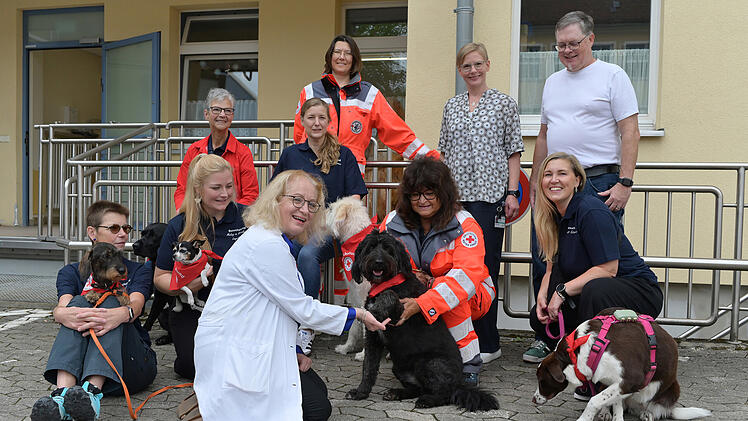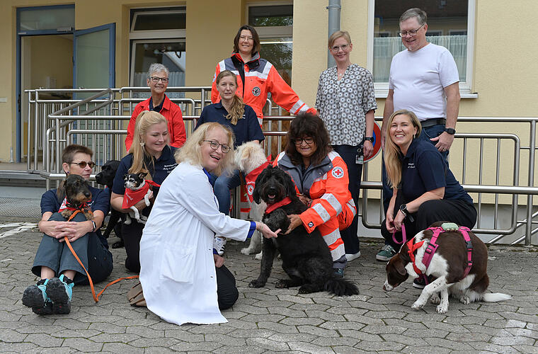 "Wir freuen uns sehr auf die Zusammenarbeit", sagte Dr. Gravou-Apostolatou, Sprecherin des Kinderpalliativzentrums, beim offiziellen Startschuss. Sina, Chico, Fritzi und neun weitere Vierbeiner haben ihre roten Halstücher angelegt und sind bereit: Künftig werden die Besuchshunde des BRK Erlangen-Höchstadt die schwer kranken Patienten des Erlanger Kinderpalliativteams zu Hause in ihrer gewohnten Umgebung besuchen. "Wir wollen das allen und ermöglichen, die sich Kontakt zu einem Tier wünschen", erklärte Dr. Gravou-Apostolatou weiter. "Das jeweilige Zweierteam aus Hund und Halterin oder Halter wird uns dann bei unseren Hausbesuchen begleiten."