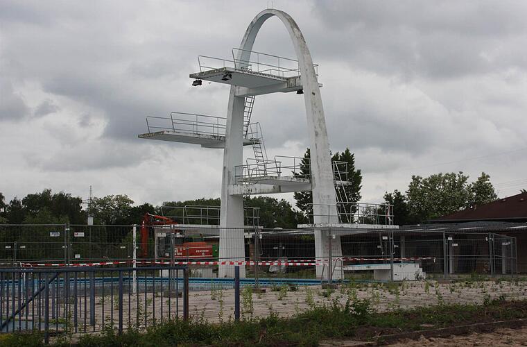 Die Abrissbagger leisten ganze Arbeit. Von dem ehemaligen "Westbad" in Erlangen ragt nur noch der markante Sprungturm zehn Meter in die Höhe. "Jetzt im Sommer fangen wir mit den eigentlichen Erd- und Rohbauarbeiten an", sagt Jörg Hutterer von den Stadtwerken und zeigt auf das großzügige Gelände im Stadtteil Alterlangen. "Wir freuen uns in Erlangen, dass wir ein neues Hallenbad und gleichzeitig ein frisch renoviertes Freibad bekommen", sagt Hutterer. "Woanders werden die Bäder geschlossen, in Erlangen werden neue Bäder gebaut", erklärt er stolz. Sogar der Sprungturm falle nicht dem Sparzwang zum Opfer.