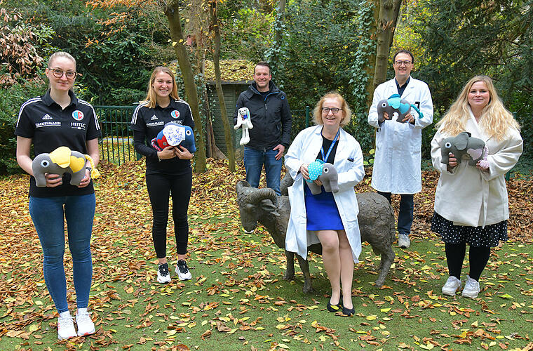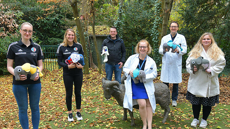Hirntumor-Forscher versteigern von HC-Erlangen-Spielern signierte Bennifanten zugunsten des Kinderpalliativteams. Der Erlös geht an die DIPG-Forschung und das Universitätsklinikum Erlangen. Die Stofftiere sollen schwer kranken Kindern eine Freude bereiten.