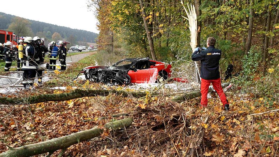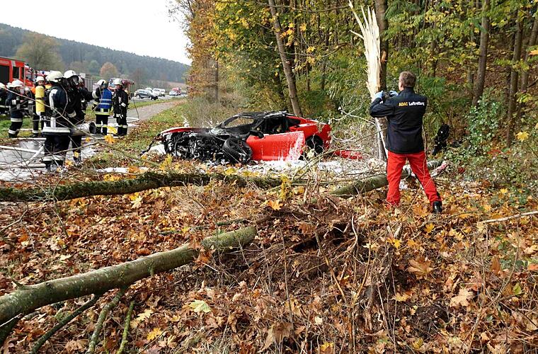 Ein Mann rast mit seinem Sportwagen gegen einen Baum, das Auto fängt Feuer, der Fahrer kann gerettet werden.