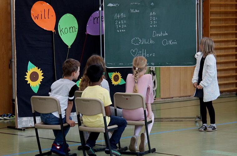 Die Klassen 4a und 4b und die Schauspielgruppe der Schule hatte sich vorbereitet, um die Abc-Schützen zu begrüßen und zu zeigen, dass Schule auch lustig sein kann. Am Tag zuvor hatte es bereits einen Schulgottesdienst gegeben, die Schulanfänger wurden im Pausenhof begrüßt und den Lehrkräften vorgestellt. Mit dem Lied "Heut zu unserm Feste" wurden die Erstklässler und die Gäste in der Turnhalle willkommen geheißen. In einer Interviewrunde berichteten die Kinder vom ersten Schultag und dass ihnen sogar eine Hausaufgabe mitgegeben wurde.