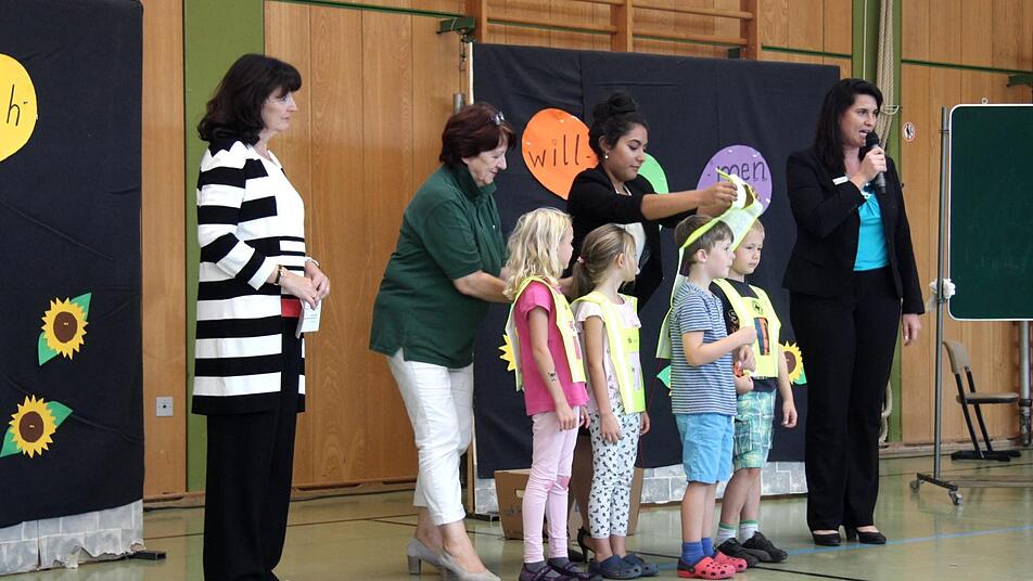Nach weiteren Liedern der vierten Klassen wurden die von der Sparkasse gestifteten Trapeze übergeben und die Schulleiterin sowie Jasmin Tischler von der Sparkassen-Filiale Niederndorf und Veronika Walther von der Gebietsverkehrswacht Herzogenaurach trugen den Kindern auf, jeden Tag die Trapeze überzuziehen. Gerade in der nahenden dunklen Jahreszeit sei es für Kinder auf der Straße besonders gefährlich. Veronika Walther schilderte Situationen, in denen Kinder sehr schnell übersehen werden. "Wir und eure Eltern wollen, dass ihr gesund in der Schule ankommt und dass auch auf dem Heimweg nichts passiert", ermahnte Jasmin Tischler, zweifache Mutter, die Erstklässler.