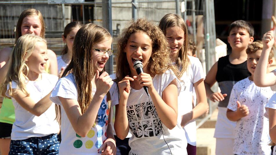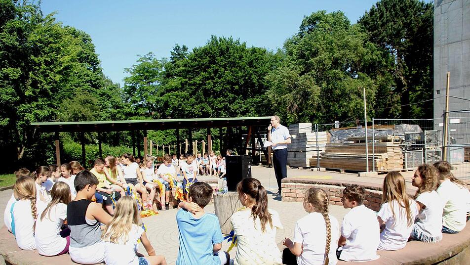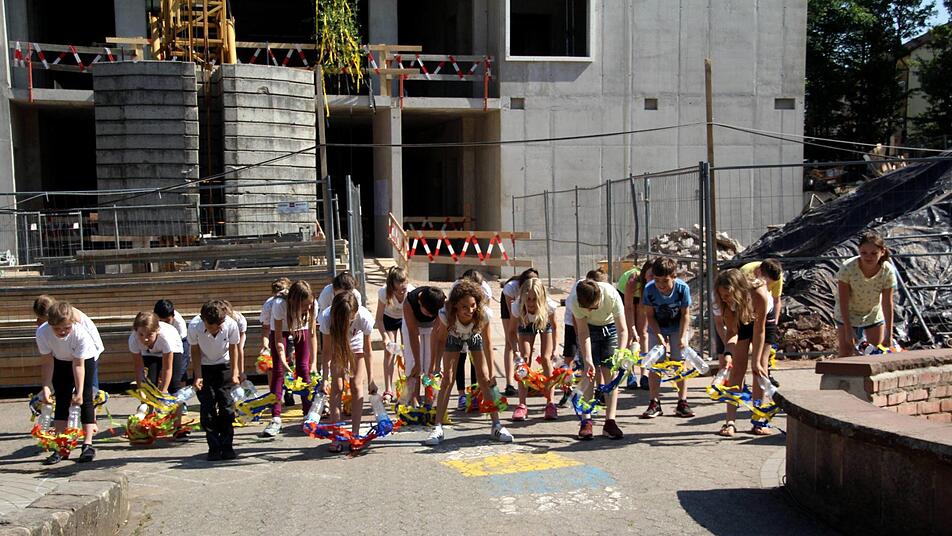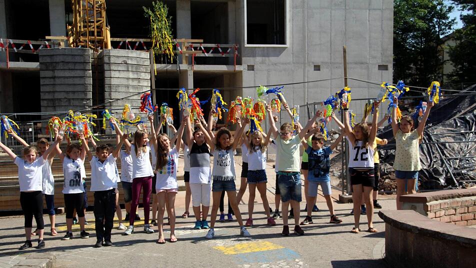 Vor dem Neubau hatten zwei vierte Klassen Aufstellung genommen und umrahmten die Feier mit Gesang und einer gekonnten Choreographie sowie Solo-Gesang. Da stand auch Schulleiter Markus Hahn nicht zurück und beschrieb die Platzprobleme der Schule und die frohe Erwartung der Fertigstellung in einem Gedicht.