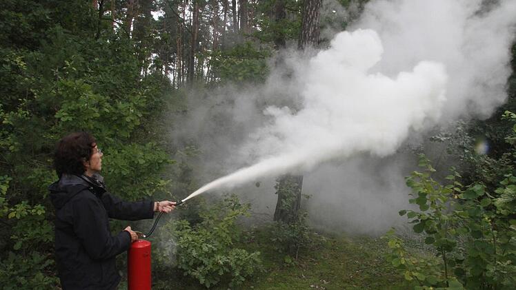 "Es war gut, sehr interessant", erklärte sie anschließend. "Es ist vor allem wichtig, dass man mal weiß, was man eigentlich machen soll." Seitzinger demonstrierte als Erste, wie es richtig geht. Zunächst die Windrichtung bestimmen, wenn es gilt ein Feuer draußen zu löschen, und dann im Abstand von etwa zwei bis drei Meter den Brandherd angehen. Bernd Nitsche erklärte, dass die Windrichtung nicht unwichtig sei, da zum einen der Qualm sonst eingeatmet wird und in der Folge eine Rauchvergiftung droht.