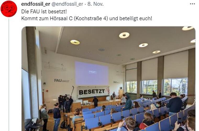 An der Friedrich-Alexander-Universität Erlangen-Nürnberg (FAU) hält ein örtlicher Ableger einer Klimaprotestgruppe namens "End Fossil" seit Dienstag (16. November 2022) um 16 Uhr den Hörsaal C in der Kochstraße in Erlangen besetzt. Die Besetzung ist Teil einer deutschlandweiten Aktion unter dem Namen "End Fossil: Occupy!". Die Gruppierung in Erlangen, die laut Medienberichten etwa 30 Personen umfasst, will damit bestimmte Forderungen - insbesondere zum aktuellen Umgang von Hochschulen mit dem Klimawandel - in die Öffentlichkeit tragen. Für Mittwochabend (9. November 2022) wurde von der Ortsgruppe eine Techno-Party im Hörsaal angekündigt. Die Uni Erlangen sieht große Sicherheitsprobleme - und kritisiert Verstöße gegen die "universitätsweite Energiesparinitiative".