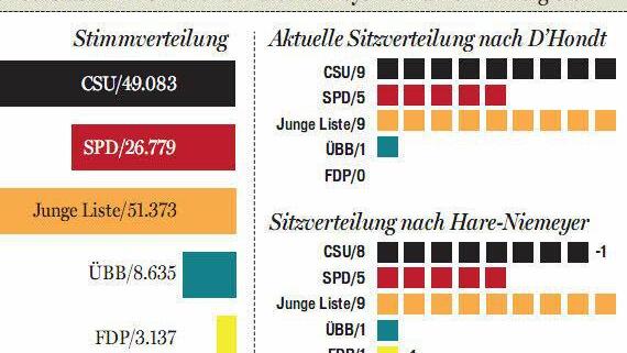 Für den Höchstadter Stadtrat hat Wahlleiter Gerhard Leicht seinen Computer zum Test mal mit dem Wahlergebnis von 2008 gefüttert und die Sitzverteilung nach Hare-Niemeyer ausrechnen lassen. Herausgekommen ist ein Sitz weniger für die CSU, den hätte die FDP bekommen. Aktuell haben CSU und Junge Liste je neun Sitze, obwohl die JL über 2000 Stimmen mehr auf ihre Kandidaten vereinigen konnte.