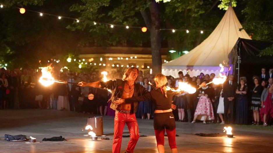 Aber das war noch nicht alles zum Thema "Feuer": um Mitternacht boten Feuerkünstler Marc Vogel und seine Kollegin eine spektakuläre Feuershow im Schlossgarten an. Vogel, der bei einer Nobelpreisverleihung bereits vor dem schwedischen König aufgetreten und vielen von der Blauen Nacht bekannt ist, begeisterte sein Publikum mit Feuerakrobatik zu Popmusik.