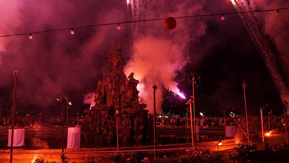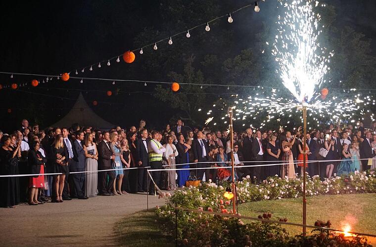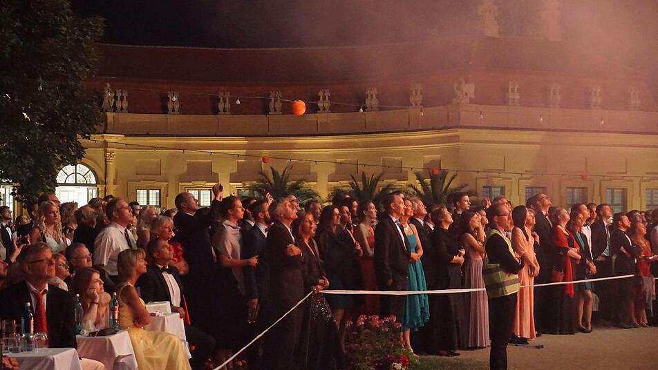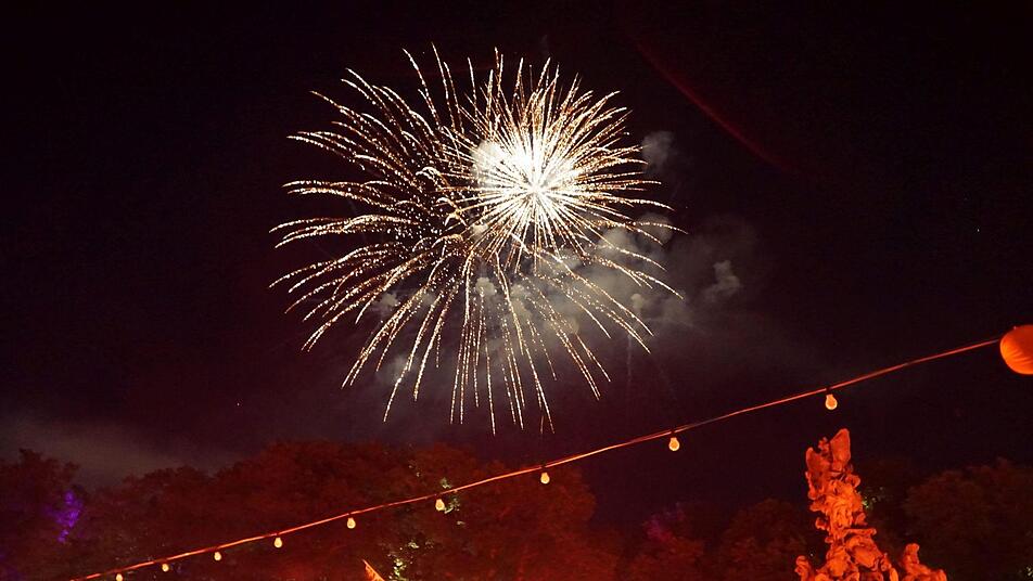 Ein Highlight war wie immer das große Feuerwerk um 23 Uhr. Es begann klein und harmlos mit Feuerrädchen am Barockbrunnen. Dann wurden die Raketen über dem Schlosspark gezündet und Feuerbälle hüpften im Takt zur Musik vom French Cancan über den Himmel. Nach etwa 20 Minuten endete das Spektakel mit regelrechten Donnerschlägen, die sicherlich weithin hörbar waren.