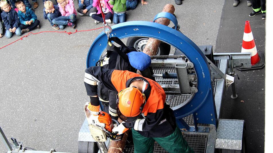 Dass der Nachwuchs bereits vom "Feuerwehrvirus" infiziert wurde, demonstrierte die Bambini-Gruppe gleich sichtlich stolz beim Löscheinsatz nach dem Sirenenalarm. Bei den nächsten Aktionen stand die Rettung von Menschen mit Sprungpolster und Leitern sowie weiteren Rettungsgeräten im Mittelpunkt. So geriet ein "Fensterputzer" in Gefahr und musste mittels einer Absturzsicherung zu Boden gebracht und dem Rettungsdienst übergeben werden. Vor allem für Waldbesitzer war das Schneiden eines Baumstammes unter Spannung interessant, denn insbesondere bei Sturmschäden liegen die Baumstämme kreuz und quer und es kommt immer dabei wieder zu schweren Unfällen. Mit einer Puppe wurde demonstriert, welche Kraft beim Durchsägen eines Baumstammes frei wird, wenn er unter Spannung steht. Ein Höhepunkt für Kinder war der Einsatz der verschiedenen Strahlrohre und der Wasserwerfer. Natürlich durften auch die Klassiker wie Rettung aus einem Pkw und das Löschen eines brennenden Autos nicht fehlen.