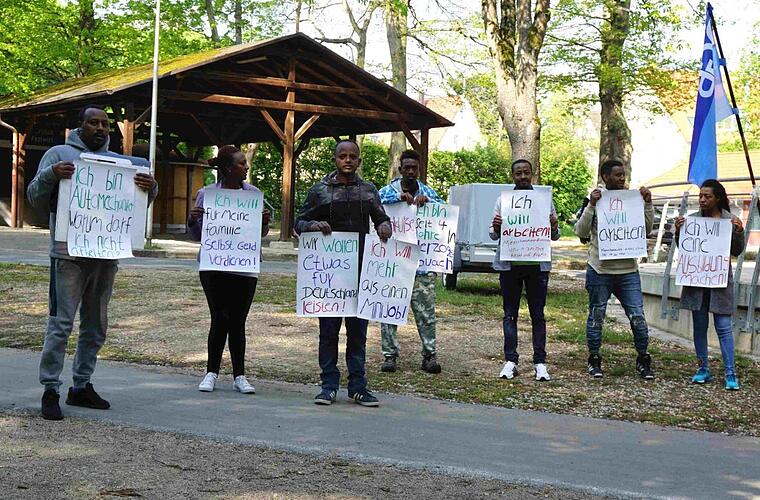 Viele von uns hatten Ausbildungsverträge in der Hand und die Betriebe waren dankbar, dass sie uns haben, weil es keine anderen Bewerberinnen gab. Wir verstehen nicht, warum uns das Menschenrecht auf Arbeit verweigert wird. Ein Arbeitsverbot bringt niemandem etwas und würde uns und auch der deutschen Gesellschaft die Zukunft verbessern. Deshalb sind wir hier, um auch den Landrat zu bitten, seine Anweisungen bezüglich der Arbeitsverbote zu lockern und uns einen Beitrag zur Gesellschaft leisten zu lassen." Abschließend baten sie um Verständnis für die Demonstration vor Bühne im Weihersbach.
