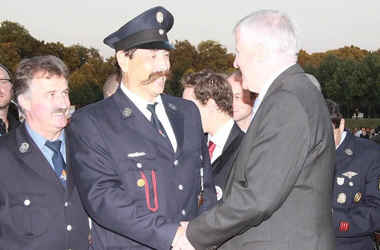 3000 ehrenamtliche Helfer der Flutkatastrophe im Juni hatte Ministerpräsident Horst Seehofer in den Park von Schloss Schleißheim eingeladen. Unter ihnen Markus Kraft, Kommandant der Uehlfelder Feuerwehr. Ihm gelang es mit einiger Anstrengung, Seehofer persönlich die Hand zu schütteln.