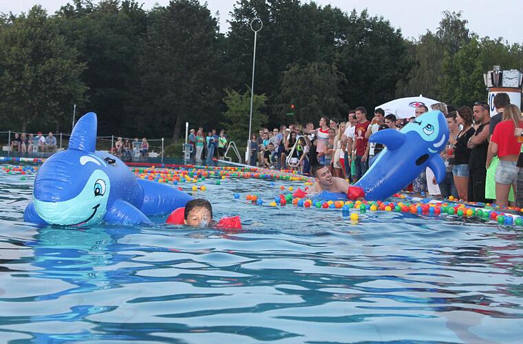 "Es geht um eine tolle Party", fassten die Inhaber des Restaurants La Passione und Initiatoren der Beachparty, Konstantin Kussberger und Christian Seegerer im Vorfeld ihren Einfall zusammen. Und die Party gelang. Begonnen hatte das Spektakel im Freibad mit einer Kinderbeachparty, die um 13 Uhr startete. Für diese hatten die Veranstalter zur Freude der Kinder unter anderem eine Hüpfburg aufgebaut und verkauften - selbstverständlich alkoholfreie - Kindercocktails. Zum Programm trug unter anderem die Wasserwacht Höchstadt bei, die für die Kleinen eine Reihe von Mannschaftsspielen veranstaltete. So durften die Kinder etwa im Schwimmerbecken gegeneinander zum Tauziehen antreten. Die Kinderbeachparty kam bei Kindern und Eltern gut an. "Ich bin mit den Kindern extra wegen der Beachparty hergekommen. Ich wollte ihnen etwas Besonderes bieten", erzählte Manuela Heger aus Höchstadt. Ihr Patenkind Celina ergänzte: "Das hier ist mal was anderes als in den anderen Bädern." Freuen dürften sich über dieses Kompliment Hans-Peter Philipp, Betriebsleiter des Sportzentrums, und sein Stellvertreter Karl-Heinz Zillich. "Die Beachparty ist natürlich Werbung für uns und die Stadt Höchstadt. Wir selbst könnten so etwas nur in kleinerem Rahmen veranstalten", so Philipp. Er rechne mit 3500 bis 4000 Besucher, erklärte Zillich. Die Inhaber des La Passione schlossen sich seinen Erwartungen an. Beide Seiten lobten die hervorragende Zusammenarbeit. "Die Stadt und wir sehen in einander starke Partner. Besonders die Herren Philipp und Zillich haben uns viele Freiheiten eingeräumt und uns viel ermöglicht", so Seegerer. Das traf besonders auf das Erwachsenenprogramm zu, das um 19.30 Uhr startete. Bei einem Wettbewerb im Schwimmerbecken galt es, unter zweitausend Plastikbällen die richtigen zu finden. Damit sie nicht untergingen, waren die Wettbewerber für diese Aktion mit Schwimmflügeln und aufblasbaren Delphinen ausgerüstet worden. Als Belohnung winkte ihnen eine Reihe interessanter Preise. Im Anschluss wurde den Gästen, neben einer Lasershow und einem Feuerwerk, auch eine Gogo-Show geboten.Wer Bedarf nach Abkühlung hatte, hüpfte in Bikini oder Badehose ins Wellenbecken, das bis nach Mitternacht geöffnet hatte. Die Gäste äußerten sich zufrieden: "Das Wetter war schön, die Musik top. Und die angenehm warme Wassertemperatur hat zum Beachparty-feeling beigetragen", erklärte ein Gast. Bei einer Wiederholung, die die Veranstalter bereits angedacht haben, sei er definitiv dabei. Zufrieden war auch der Einsatzleiter von Wasserwacht und Rotem Kreuz. Von Beginn der Veranstaltung bis Mitternacht habe man nur einige verschmerzbare Blessuren zu verarzten gehabt.