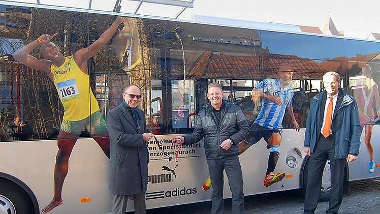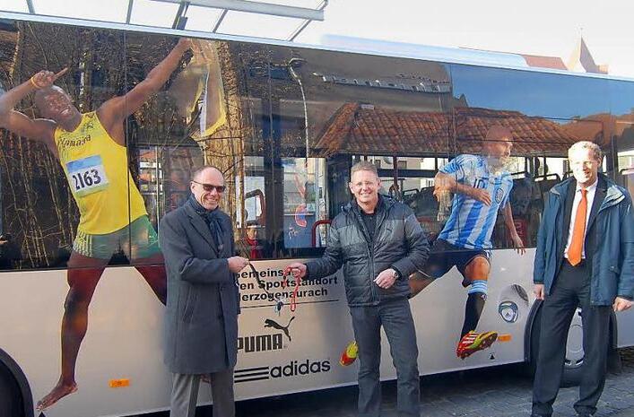 Am Montag wurde erste von vier neuen Stadtbussen präsentiert, der eine neue Werbebeklebung trägt. Gemeinsam wird diese gestaltet von den beiden Herzogenauracher Sportartikelfirmen Adidas und Puma. Die Basis bilden aktuelle Spitzensportler, die bei den Firmen unter Vertrag stehen und für verschiedene Sportarten stehen.
