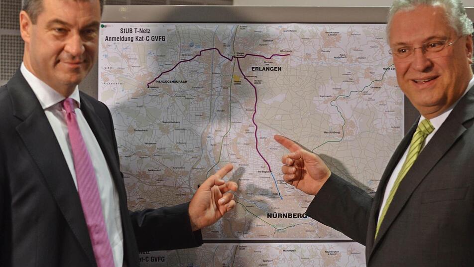 Mehr Geld vom Freistaat versprach nun Markus Söder am Montag bei einer gemeinsamen Pressekonferenz mit Innenminister Joachim Herrmann (beide CSU) für die geplante Straßenbahn zwischen Herzogenaurach, Erlangen und Nürnberg. "Mit der Aufstockung unserer staatlichen Förderung um weitere zehn Prozent auf dann 30 Prozent der zuwendungsfähigen Kosten können wir jetzt insgesamt rund 76 Millionen Euro an Fördermittel in Aussicht stellen", verkündeten die Minister.