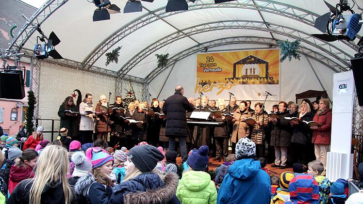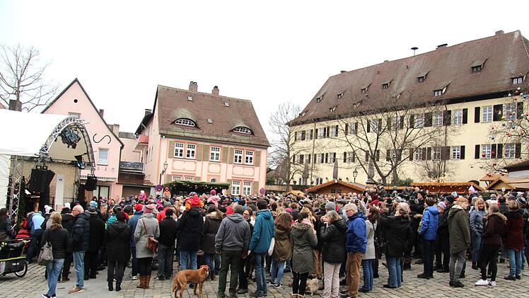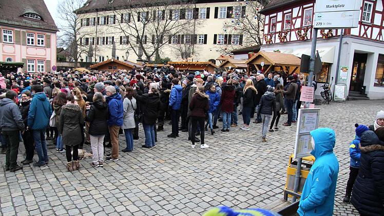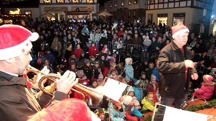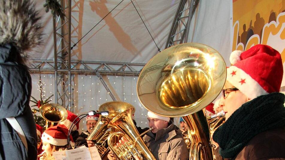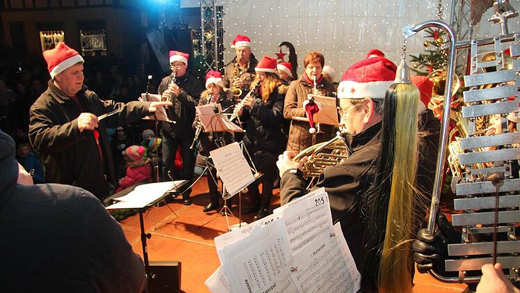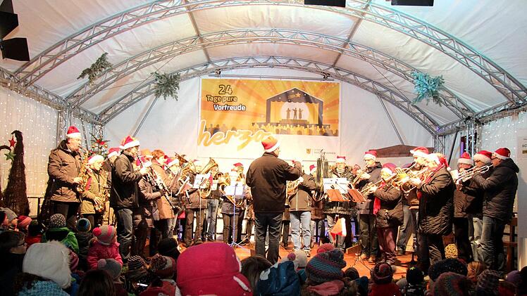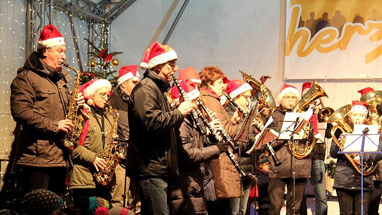 Bereits am Tag vor dem Heiligen Abend war es richtig weihnachtlich. Keine Zauberer, Jongleure, Künstler oder Kindergartenkinder, wie in den Adventstagen zuvor, traten auf die Bühne, sondern mit dem Ehemaligen der Stadtjugendkapelle ein Blasorchester mit Nikolausmützen. Die Ehemaligen sorgten mit der "Petersburger Schlittenfahrt", mit "Feliz Navidad und "Stille Nacht" sowie weiteren bekannten Liedern für weihnachtliche Stimmung auf dem Marktplatz. Bernhard Schwab, der ehemalige Präsident der Stadtjugendkapelle, nutzte auch gleich die Gunst der Stunde. "Wir waren alle mal so klein wie ihr und haben ein Instrument gelernt und es macht heute noch Spaß", warb er vor den vielen Kindern vor der Bühne um Nachwuchsmusiker.