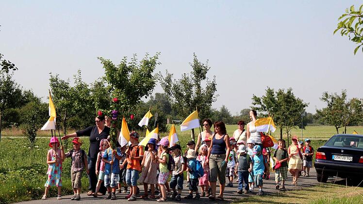 Pfarrer Hans Eisend, ehemaliger Pfarrer von Adelsdorf, hielt die Festpredigt und Pater Josef Steger, sowie Dekan Josef Dobeneck - beide gebürtige Weppersdorfer - und der Jungpriester aus Kamerun, Christian Bouwé, feierten gemeinsam die Heilige Messe. Eine Prozession mit dem Allerheiligsten zur Kreuzigungsgruppe am Ortsausgang schloss sich dem Gottesdienst an. Dort trafen die Kleinen des Kindergartens Sancta Maria recht geschafft von der Hitze ein und sangen ein Lied.