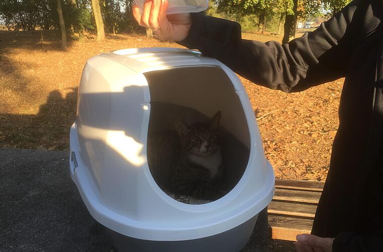 Alarmiert beugten sich die beiden Frauen zu dem Behälter hinunter, öffneten ihn und blickten direkt in die ängstlich aufgerissenen Augen einer grau getigerten Katze, die sich in die hinterste Ecke ihrer Katzentoilette - denn darin war sie eingesperrt - zurückgezogen hatte. Die Kügelchen daneben entpuppten sich als loses Katzentrockenfutter, für sie unerreichbar. Wie lange das Tier schon in seiner Toilette dort hatte ausharren müssen, ist unklar. Ohne Skrupel hatte wohl ein Mensch seinen ehemaligen Hausgenossen auf dem wenig beleuchteten Parkplatz abgestellt, einfach ausgesetzt, entsorgt wie Abfall. Dass die Katze gefunden wurde, war glücklicher Zufall, so stark frequentiert ist diese Sitzgruppe wohl nicht.
