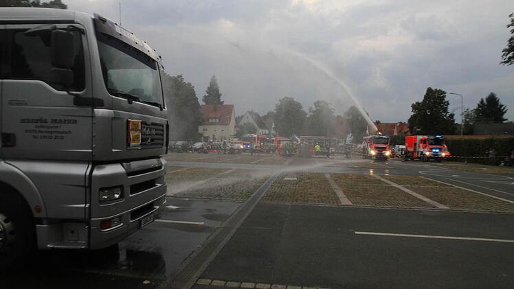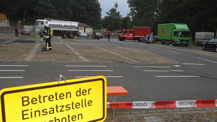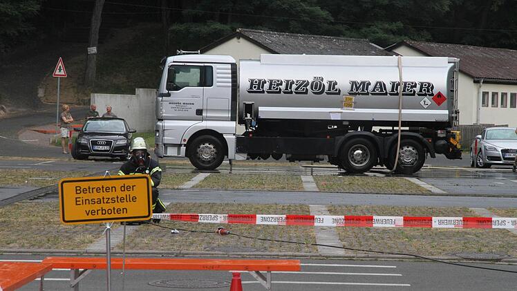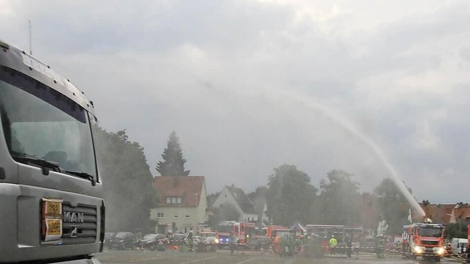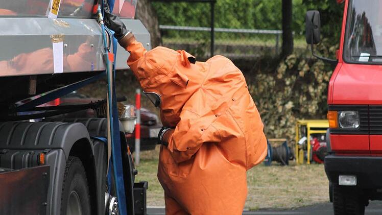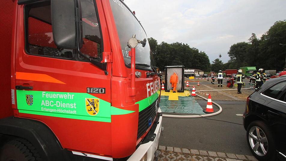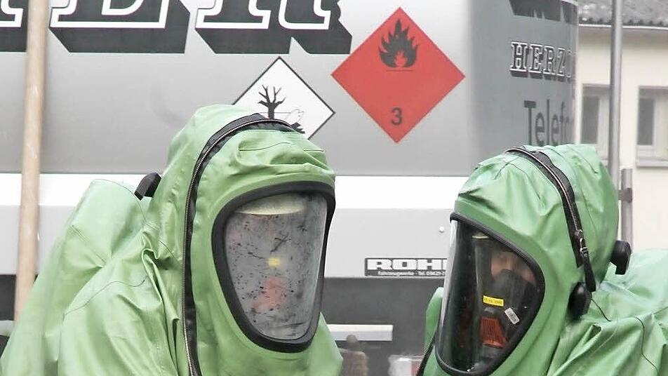 Das Herzogenauracher Unternehmen Heizöl Maier hatte einen Tanklastzug zur Verfügung gestellt, der in diesem Falle allerdings kein Öl, sondern den Stoff Triethylamin geladen haben soll. Anhand der Nummer auf dem Gefahrenschild erkannten die Einsatzkräfte frühzeitig, dass sie nicht allzu nahe an die Einsatzstelle heranfahren durften. Das Lösungsmittel sorgt beim Einatmen und bei Hautkontakt für schwere gesundheitliche Schäden.