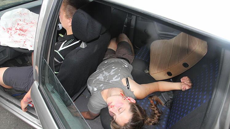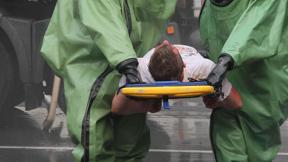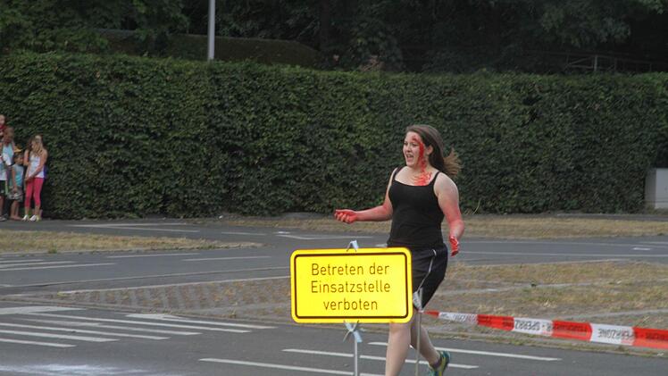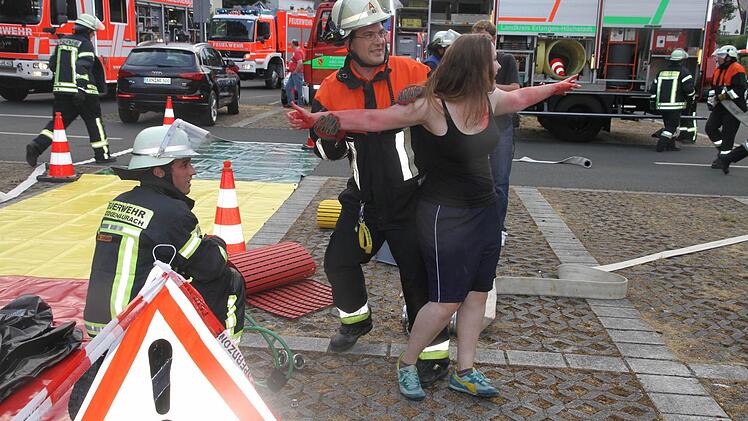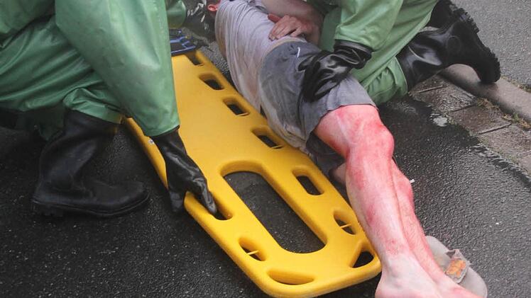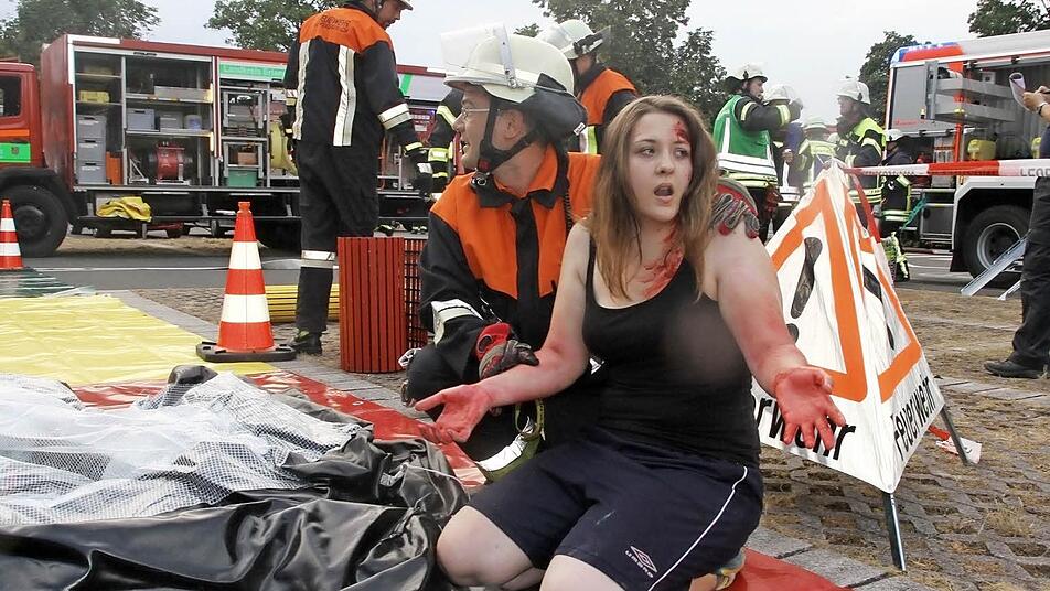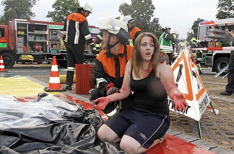 Es sind Schreie, die einem das Mark in den Knochen gefrieren lässt. Sina Aue läuft quer über den Platz: "Schmerzen, es sind solche Schmerzen! Warum hilft mir keiner?" Dann klammert sie sich an den Kommandanten und Einsatzleiter Matthias Rocca, um endlich Hilfe zu bekommen. Der reagiert professionell und ordert sofort einen seiner Feuerwehrleute heran, der sich um das schreiende Opfer kümmern soll. Immerhin hat er einiges zu tun.