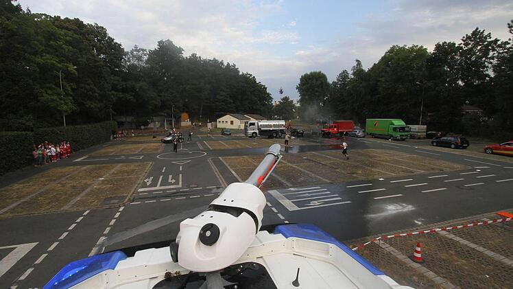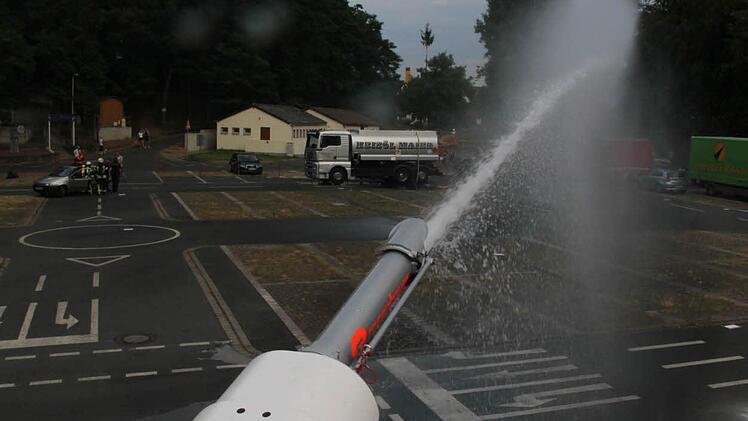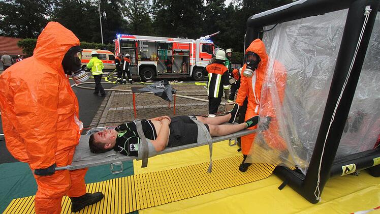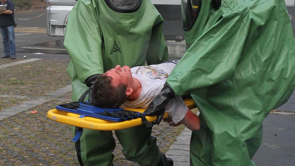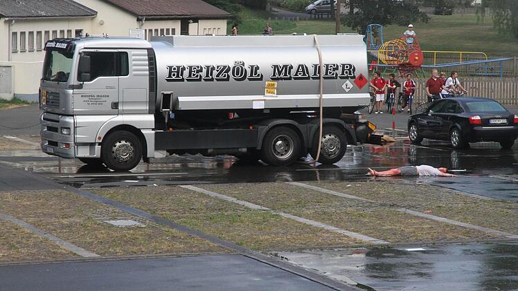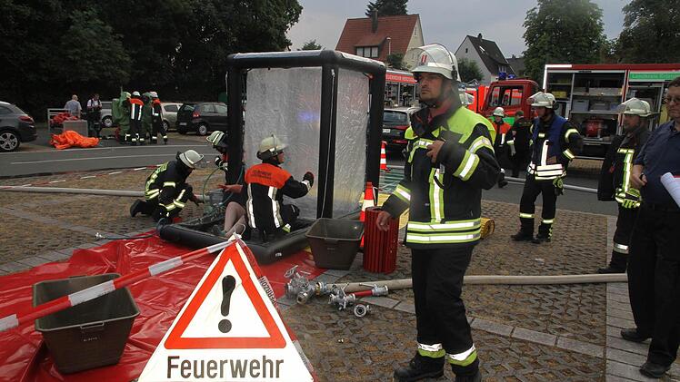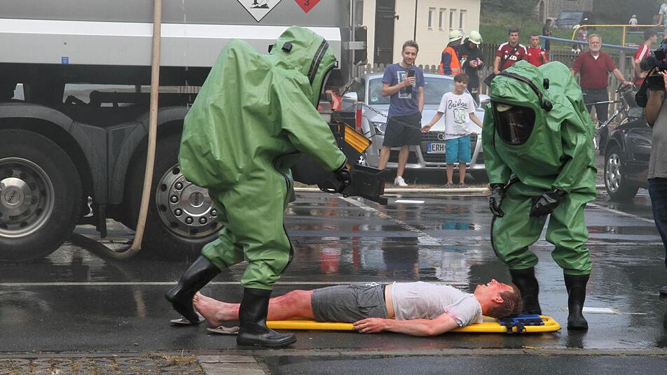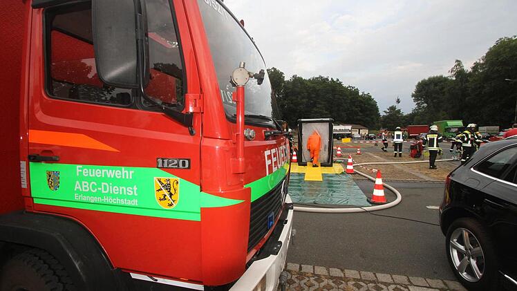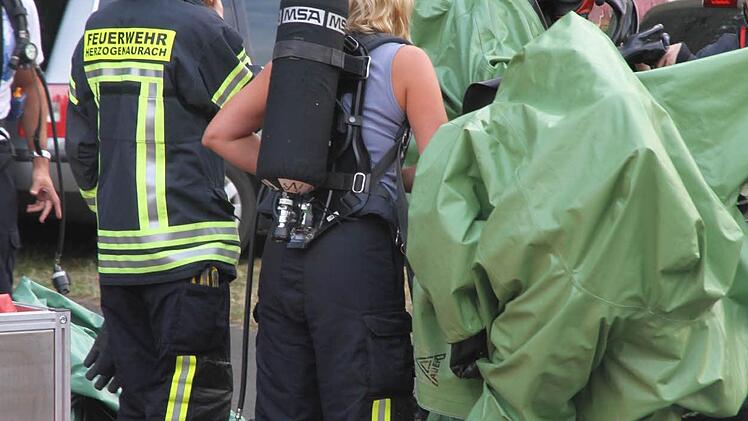 Triethymalin geladen Um 19.17 Uhr erklangen die Piepser der Feuerwehrleute Herzogenaurach. Gleichzeitig wurden die Rettungsdienste alarmiert. Sebastian Hagen und Patrick Dreher hatten sich ein Szenario ausgedacht, das im engsten Sinne des Wortes "echt ätzend" war. "Verkehrsunfall mit einem Tanklastzug - ein unbekannter flüssiger Stoff tritt aus, mehrere Verletzte", so hatte es in der Alarmierung geheißen.