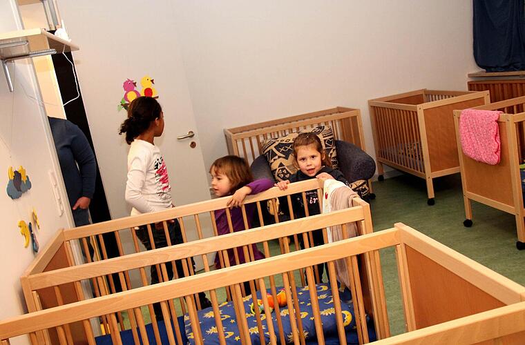 Rita Weller, die die Gesamtleitung aller Adelsdorfer katholischen Kindergärten inne hat, berichtete: "In der Krippe werden Kinder von acht Wochen bis drei Jahren betreut. Im September haben wir mit acht Kindern - noch in den Räumen der alten Kinderkrippe - angefangen, jetzt sind es bereits zehn Kinder." Bis zu 15 Kinder dürfen Gudrun Weinert (Erzieherin) und Anja Schlang (Kinderpflegerin) hier betreuen. Drei großzügige, helle Räume stehen ihnen zur Verfügung: ein Gruppenraum - der Hauptspielraum mit einem einladenden, gemütlichen Sofa, ein Intensivraum und ein Schlafraum - mit 15 Bettchen.