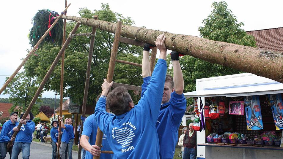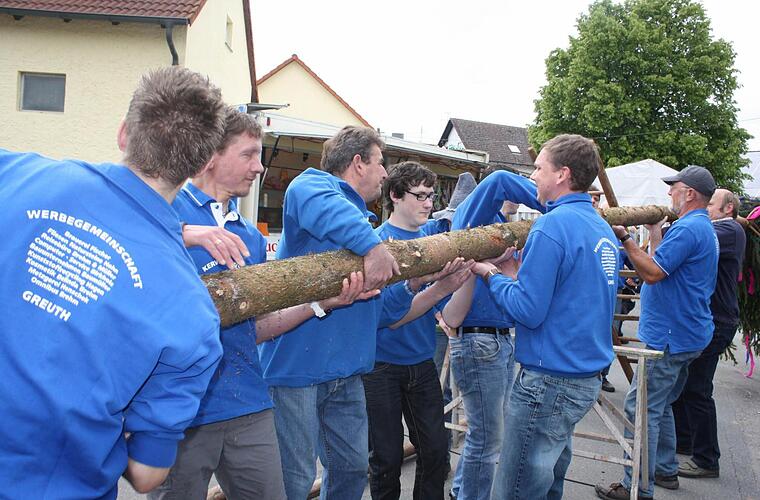 19 Meter Baum waren es, den die Männer von der Kerwagemeinschaft Greuth am Samstag locker in die Höhe brachten. Kein Rekordmaß, aber darauf legen sie auch überhaupt keine Wert. Unter Ansage und Leitung von Wolfgang Ackermann wusste denn auch jeder, wo und wie er anpacken musste, damit das Kirchweihsymbol auch bald an seinem Platz stand. Das Wetter meinte es gut mit Aktiven und Zuschauern - drohende Regenwolken hatten sich rechtzeitig verzogen.