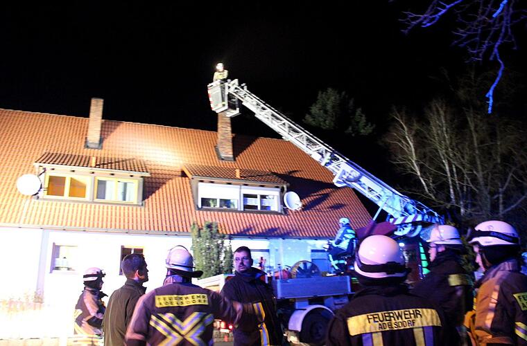 Beim Eintreffen der Wehren aus Adelsdorf, Aisch und Höchstadt war der Brand - die Kaminabdeckung hatte gebrannt - allerdings schon gelöscht. Der Feuerwehr musste mit ihrem Kehrwerkzeug drei Mal den Kamin durchkehren und anschließend musste der herbei gerufene Schornsteinfeger alles noch einmal kontrollieren. Die Feuerwehr aus Höchstadt musste anrücken, denn bei Kaminbränden ist immer eine zweite Drehleiter Vorschrift. Auch der Sanitätswagen war vor Ort - auch dies ist bei Kaminbränden Vorschrift.