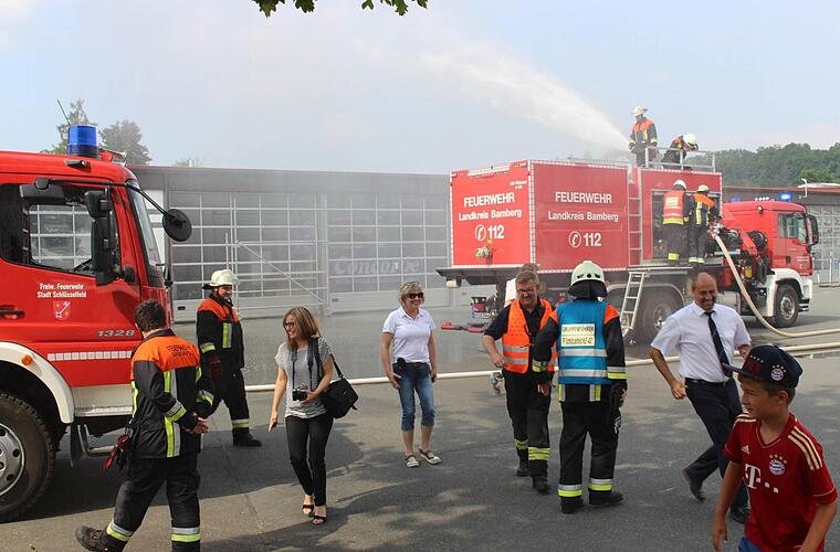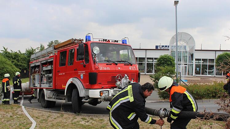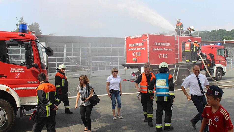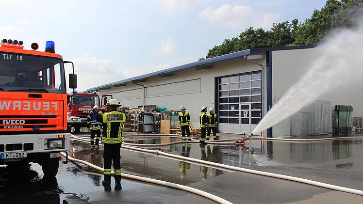 150 Feuerwehrleute aus den Gemeinden Schlüsselfeld, Burghaslach und Geiselwind beweisen beim Reisemobilhersteller Concorde in Aschbach ihre Schlagkraft.