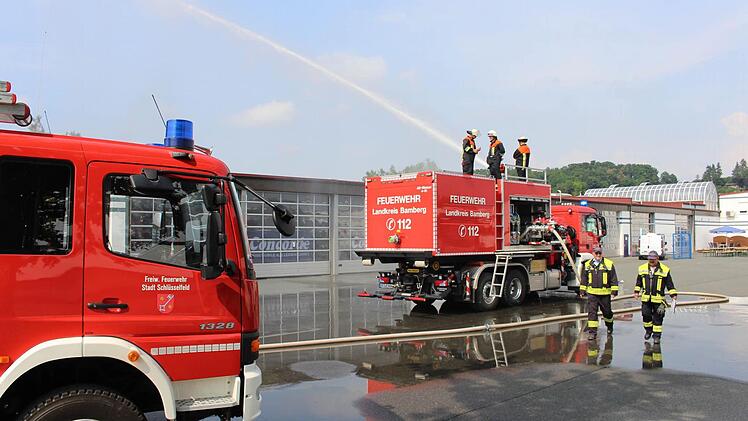 Zehn Feuerwehren aus den Dreifrankeneck-Gemeinden Schlüsselfeld, Burghaslach und Geiselwind waren bei einer Großübung auf dem Gelände des Aschbacher Reisemobilherstellers Concorde im Einsatz.