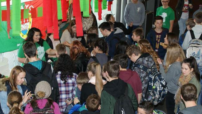 Überraschung für ihre Austauschpartner in Castlebar bereitet: In der Pause wurde ganz groß der Mayo-Tag gefeiert. Voller Begeisterung hatten die Schüler die Aula der Realschule in den Mayofarben grün und rot geschmückt und die Fahne des County Mayo schwebte über den Köpfen der Kinder an der Bühne.