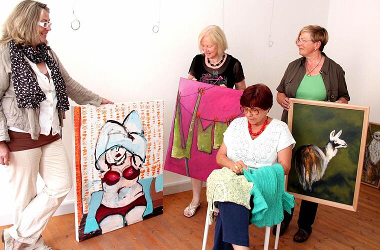 Die Ausstellung in den Räumen des Adelsdorfer Schlosses trägt den Titel "Pinsel trifft Nadel". Die bildenden Künstlerinnen Brigitte Graf-Nekola, Lydia Trossen und Gisela Koch zeigen ein breites Spektrum ihres Kunstschaffens. Die Palette reicht vom detailgetreuen Tiermotiv und Porträt bis zum abstrakten Kunstwerk. Die Kunsthandwerkerin Eva Ballnath vervollständigt das Quartett mit interessanten Strickunikaten. Das Quartett hat sich beim Tennisspielen schon vor mehr als 15 Jahren gefunden.