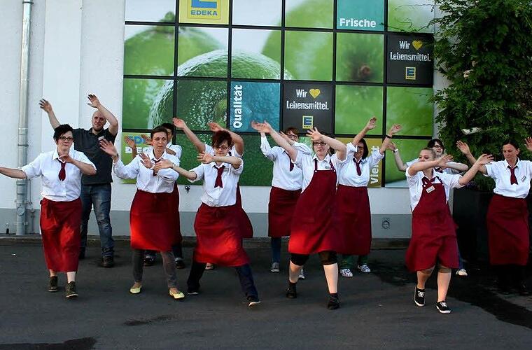 Auch die Angestellten des Edeka-Marktes Degen schwärmen noch von ihrem Einsatz. "Na klar mussten wir da mitmachen.", erklärt Liane Montuori. "Der Tanz war net schwer und wir alle haben viel Freude dabei gehabt."