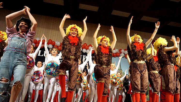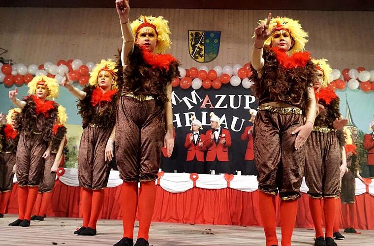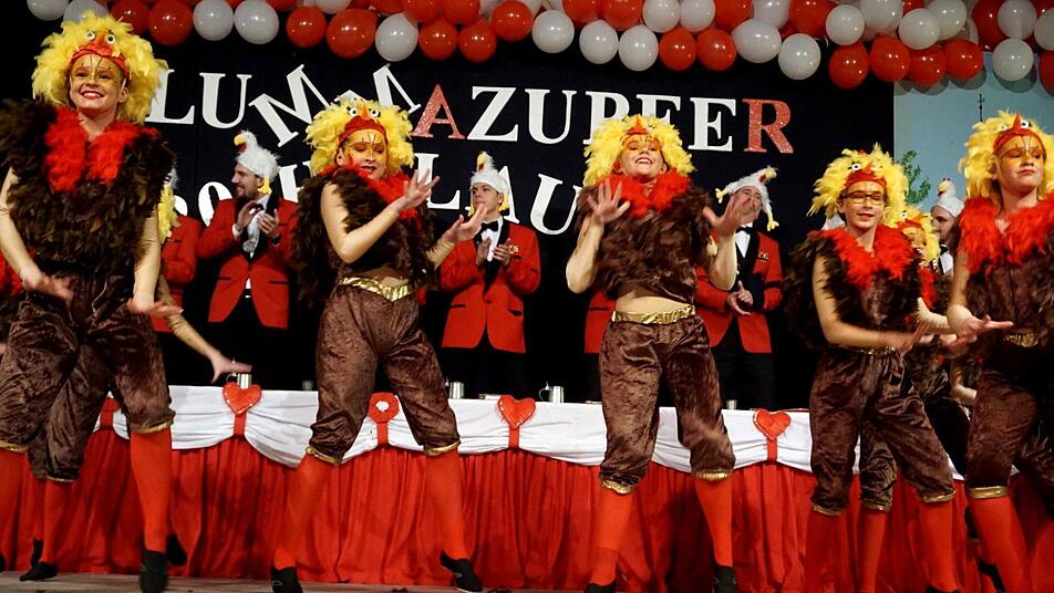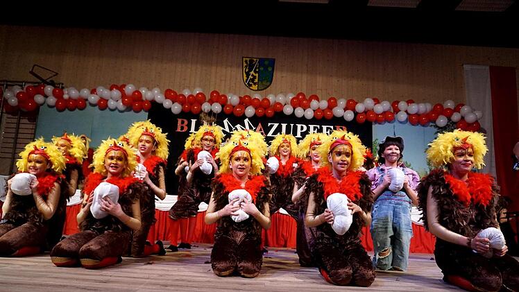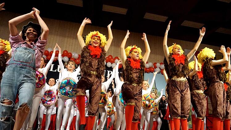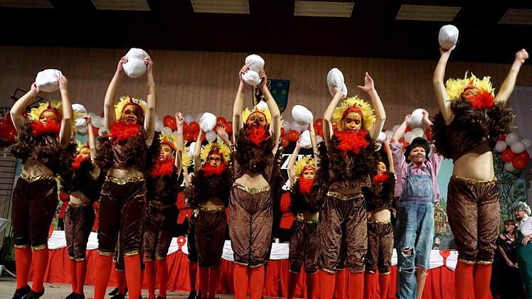 Als der Saal abgedunkelt wurde, wirbelten die Allersberger "Flecklashexen" durch die Halle, enterten die Bühne und begeisterten mit ihrer Akrobatik. Vor dem kleinen Finale hieß es beim Schautanz der Juniorengarde: "Der Käfig muss weg, damit das Ei auch schmeckt", und auf der Bühne tummelte sich eins Hühnerschar.