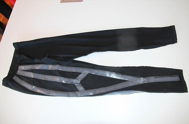 Die Idee mit dem Tapen war von der Idee der Entwicklungsmannschaft gar nicht so weit entfernt. In einer normalen Hose wurde ein Bein mit einem Silikonband (handelsüblich, Heimwerkermarkt) versehen, das zweite Bein blieb frei von dem Inlet. "Dann schickten wir Läufer damit los, die nicht wussten, warum wir die Hose so präpariert hatten", erklärt Krauß. Und diese berichteten von dem Effekt, dass das eine Bein "leichter" schien, nämlich das Silikonbein.
