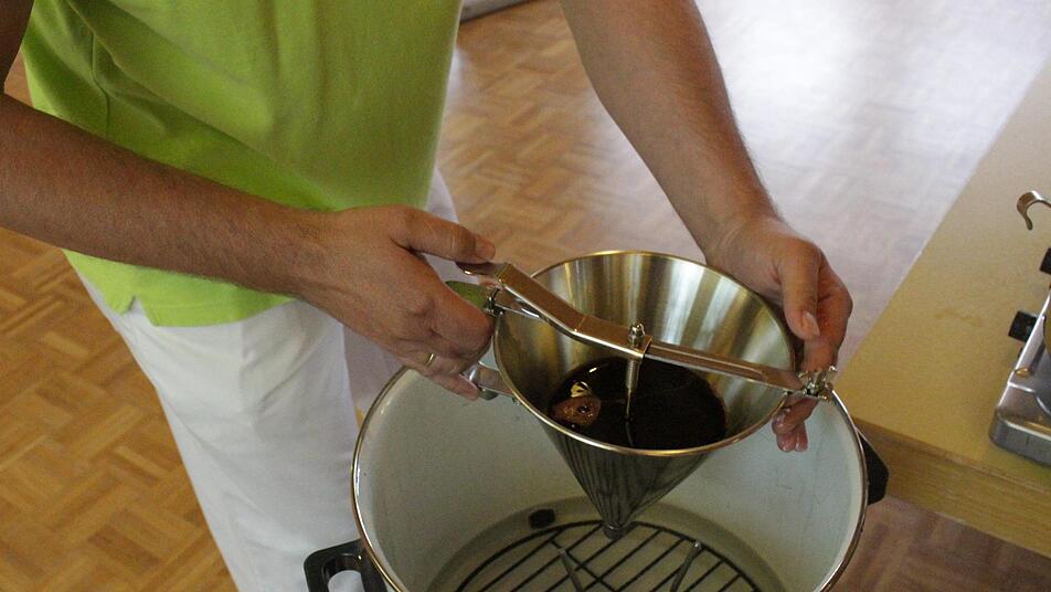 Die Grundzutaten eines jeden Gummibärchens seien Sirup, Gelatine, Vitamine, Wasser, Zucker und Zitronensäure. Je nach Geschmack fügt Müller dann noch Aroma, Farbe und Saft hinzu. Alles wird vermengt, verrührt und anschließend in einen Trichter gefüllt: "Das wäre mal ein Traum, darin zu baden!" Wie der Bonbonhersteller am Freitag zeigte, drückt eine Maschine in Maismehl die typischen Formen ein, anschließend werden die mit der Gummibärchenmasse befüllt. Zwei Tage dauert es jetzt, bis die Süßigkeiten aushärten und gegessen werden können.