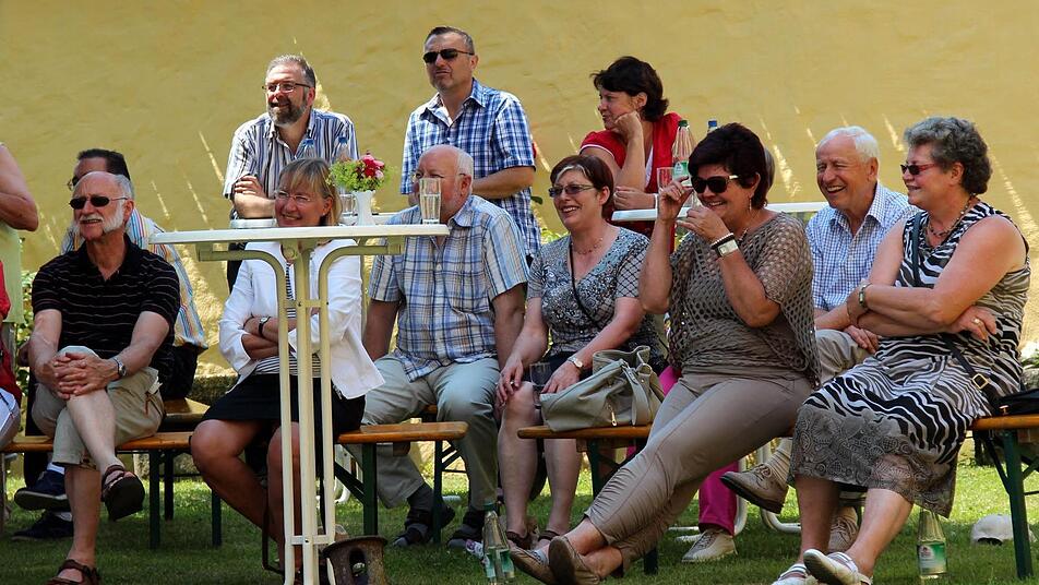 Mit Helmut Haberkamm hatten die Gemeinde Adelsdorf und die öffentliche Bücherei einen wahren Ästheten des fränkischen Dialekts eingeladen, um den "Tag der Franken" zu feiern. Unter dem Titel "Babbierdiecher und Summerfliecher" führte er auf Fränkisch die Gäste im Adelsdorfer Schlossgarten durch "Johr und Dooch". "Wir sind wegen Haberkamm da", erklärte ein Ehepaar aus Hemhofen und ein Paar aus Röttenbach kennt Haberkamm schon aus vielen anderen Lesungen. "Und das Ambiente hier im Schloss hat uns auch noch angezogen."