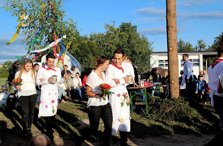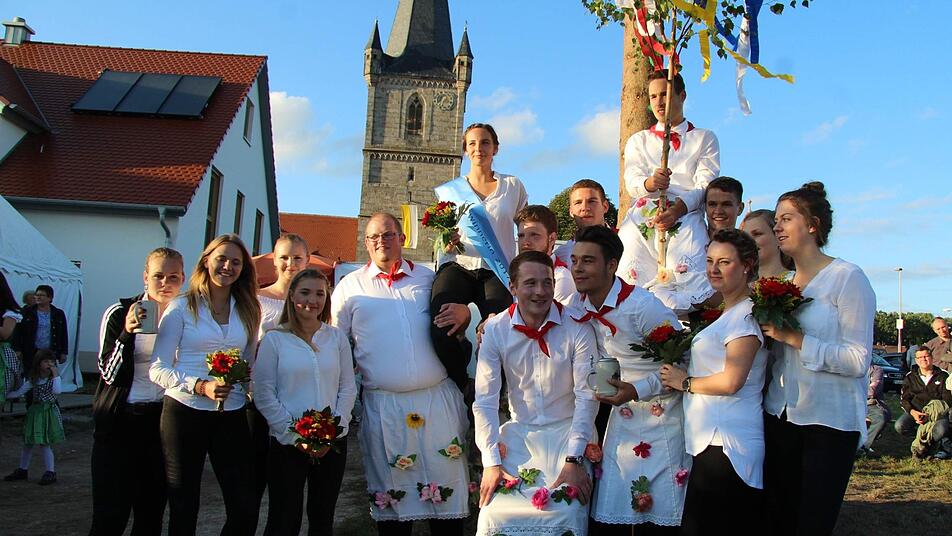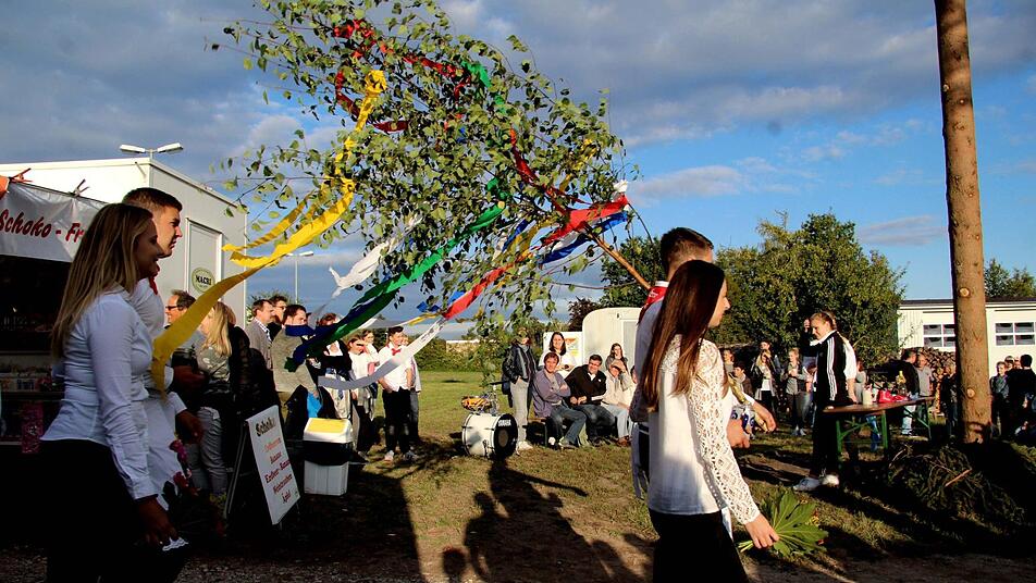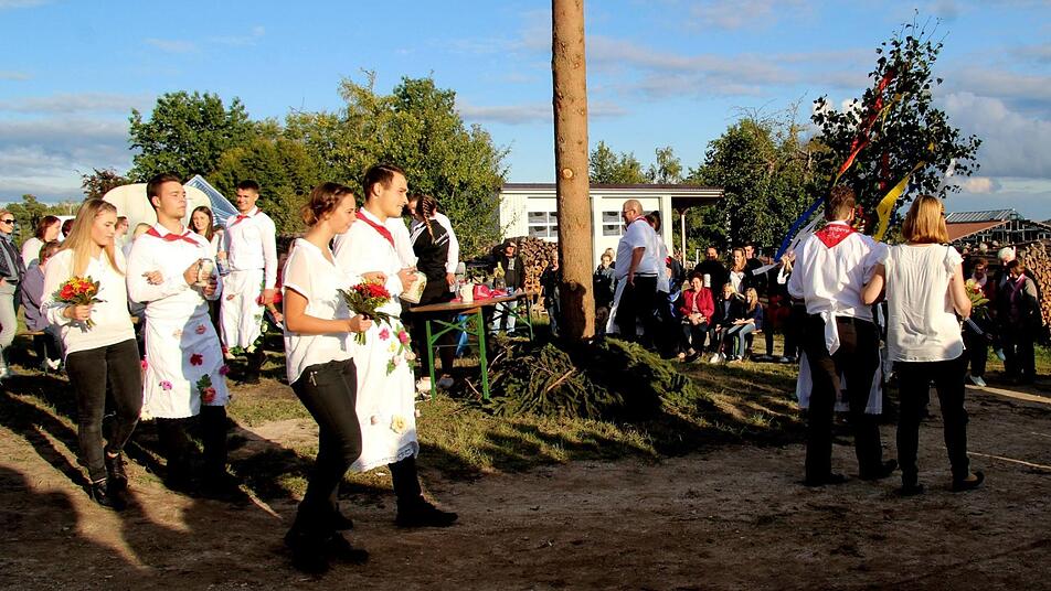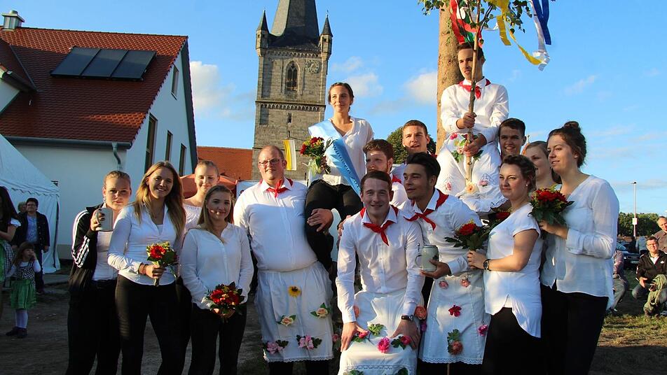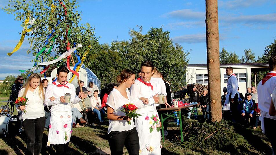 Mit dem traditionellen "Raustanzen" endete die Kerwa in Hannberg. Bevor bei Verena Essl und Nicolai Nagel der Wecker klingelte, gab es reichlich Spott und Häme für den fast fertigen Dorfplatz. Die kreativen Ortsburschen und Ortsmadla schmückten die Absperrung am Dorfplatz mit Birkenzweigen sowie Maßkrügen und luden mit "Bier zum Schöntrinken" zur Kerwa ein.