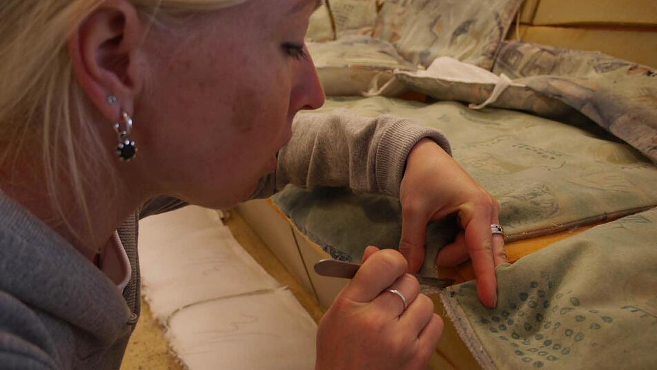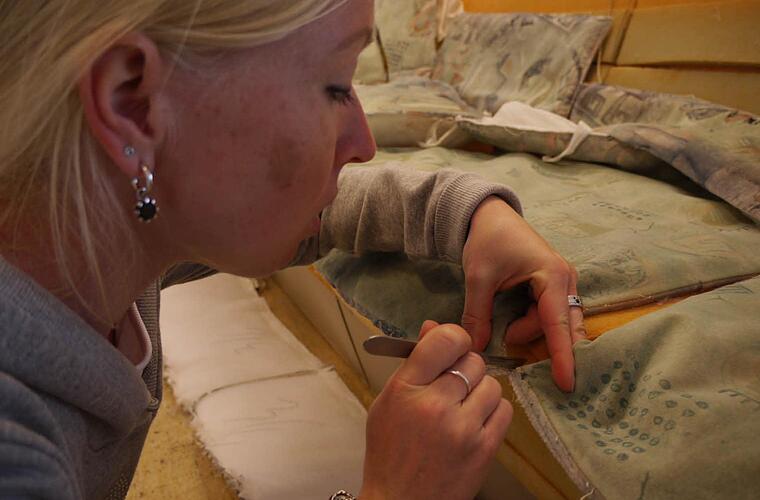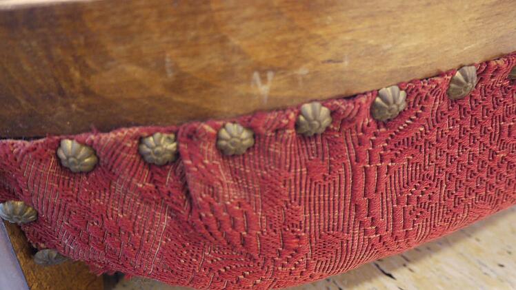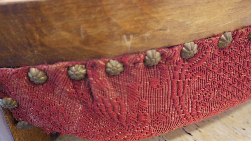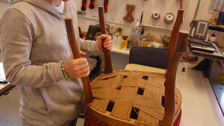 Vorsichtig öffnet sie mit einem Federmesser den Sitzbezug. Der Unterbau scheint noch gut erhalten zu sein. Hier wird sie kaum etwas auswechseln oder richten müssen. Ganz anders bei dem Biedermeier-Stuhl. Auf ihn sollt e sich niemand mehr setzten. Hier ist eine Generalsanierung der gepolsterten Sitzfläche nötig.