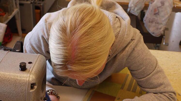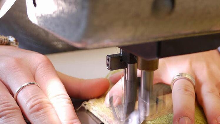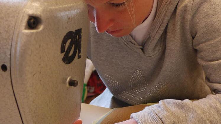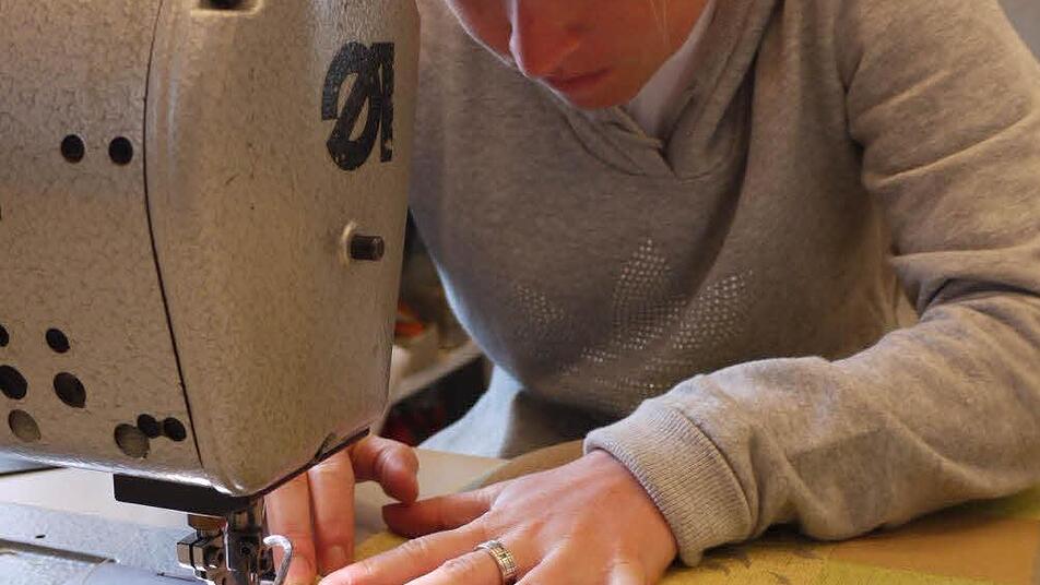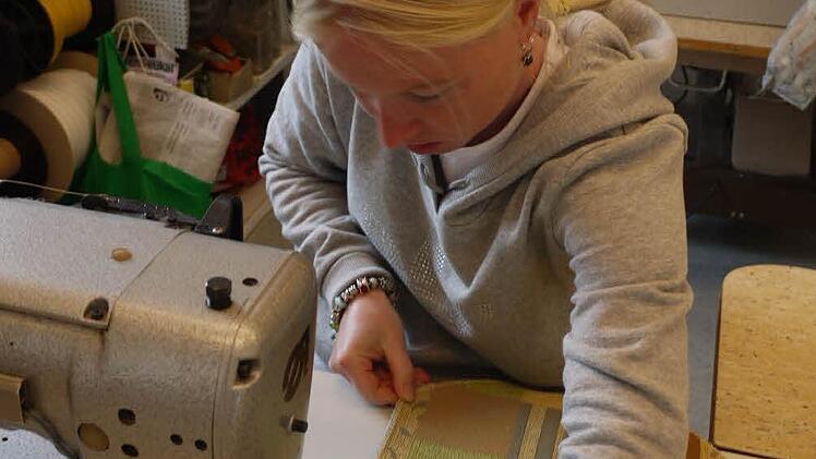 Wenn zum Beispiel das Sofa auf dem zweiten Arbeitstisch einen neuen Bezug erhält. Sorgfältig trennt Buchhold den alten auseinander. Damit hat sie gleich die Zuschneideschablone. Haargenau auf Kante legt sie sie auf den neuen Bezugsstoff und schneidet die Form nach. Jede Kante wird mit der Overlock-Maschine versäubert und dann zusammengenäht.