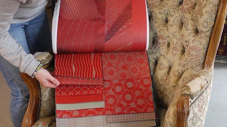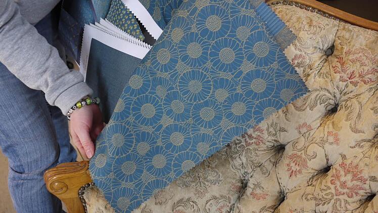 Gestreift oder streng geometrisch kann ich hier nicht empfehlen, sagt sie und hält mal eine Stoff-Kollektion in Rot, mal eine in Blautönen an den Sessel. "Die Heftung muss erhalten bleiben", erklärt sie zum Möbelstil. Heftung, das sind die tief ins Polster genähten Knöpfen, die dem Rücken das typische Muster verleihen.