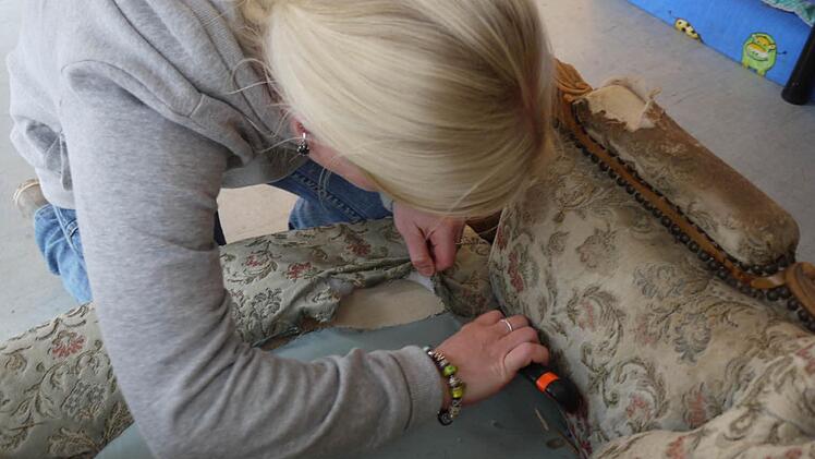 Dicht gedrängt stehen verschieden Stühle und Sessel in einer Ecke der Polsterei Lindner. Sie warten alle auf die gechickten Hände von Alena Buchhold, der Tochter des Gründers Walter Lindner. Bei dem einen ist die Sitzfläche schadhaft, der andere soll einen neuen Bezug bekommen. so manches Stück muss von Grund auf aufgemöbelt werden.