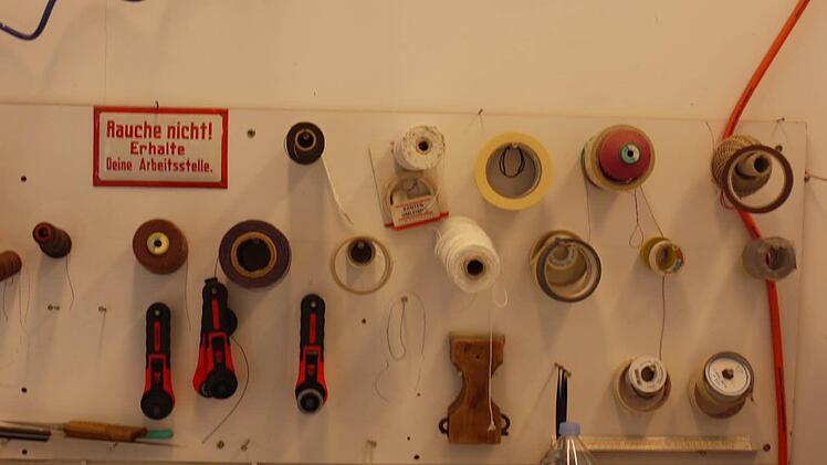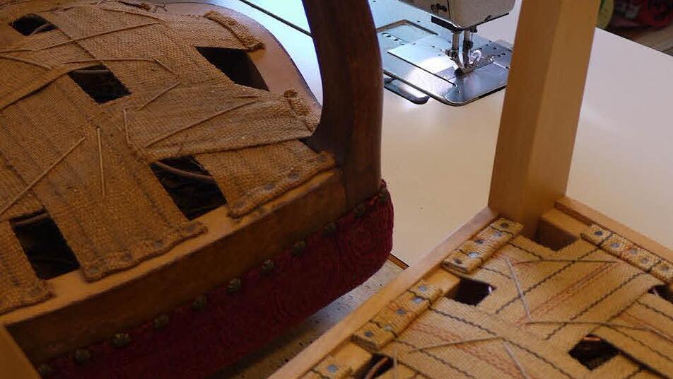 Neun "Schichten" sind das. "Und es beginnt von unten", sagt Buchhold und stellt den Stuhl mit den Beinen nach oben auf absenkbaren Arbeitstisch .Es beginnt mit der Gurtung. Breite Jutebänder werden mit Nägeln am Rahmen befestigt und mit einer Art Paketschnur verschnürt. Dann werden die Spiralfedern aufgenäht und auch wieder verschnürt. Zum Schutz der Benutzer kommt ein Lage Federleinwand - man kennt sie auch als Rupfen - darauf, ehe das Palmfaserpolster aufgearbeitet wird. Eine Schicht Fassonleinwand deckt es ab. Mit ihr entstehen die Kanten des Polsters.