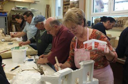 Bei der Gestaltung ist allerdings sehr viel persönliches Geschick erforderlich. "Eigentlich sind an der Werkbank in der Mitte nur Plätze für sechs Interessenten vorgesehen, aber in diesem Kurs haben wir acht Erwachsene, sodass einige auf die seitlichen Werkbänke ausweichen mussten!" erzählt Manfred Lukasch, Vorsitzender der Krippenfreunde.