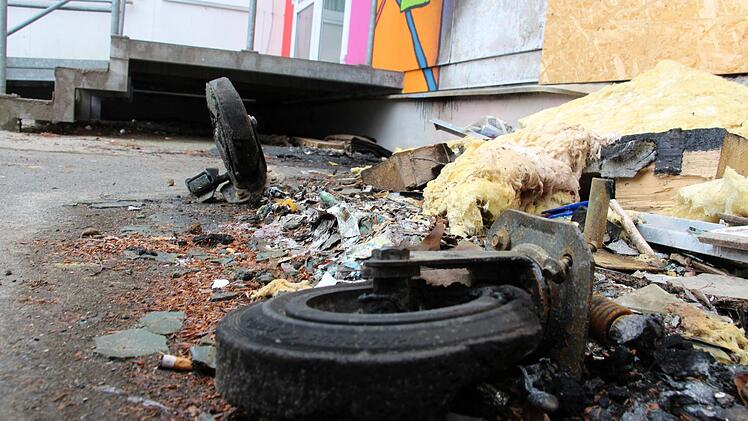 Sogar der Brandschutt inklusive verkohlter Räder des Müllbehälters zeugt immer noch an Ort und Stelle vom Feuer. Ein Hauch von Ghetto umweht den Eingangsbereich des Vereinshauses, das auch von der Mittelschule genutzt wird. Derzeit eine eine der schmucklosesten Ecken der Stadt. Dass der Schutt optisch untragbar ist, findet auch Bürgermeister Gerald Brehm (JL).