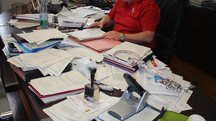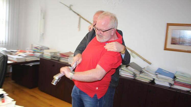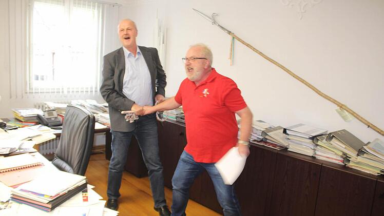 Hänjes lachend beim Anblick des SchrEeibtischs mit Papierbergen: "Mensch Beppo, du bist ein echter Hoch- und Weit-Stapler." Doch selbst beim Narren-Sturm gab es eine Menge zu lernen. Erstmals offenbarte sich Brehm nicht ganz ernsthaft zum Streit um die Namensgebung des Franziskus-Rings in Höchstadt: "Ich heiße doch selbst auch Franz." Also Gerald Franz Brehm?