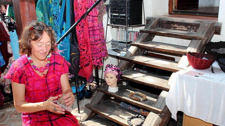Barbara Eichhorn (Filzdesign) aus Heroldsbach wartet im Wintergarten des Kochschen Familienanwesens in einem selbst entworfenen und gefilzten Kleid aus Nuno-Filz auf Besucher und erklärt gleich den Umstehenden, was das für eine Filz-art ist. " Wolle wird mit einem zweiten Material zusammen gefilzt, in diesem Fall mit Seide. Dieser Stoff ist durchlässiger und auch noch bei großer Hitze angenehm zu tragen." Sie fertigt überwiegend Hüte und Bekleidung, aber auch anderen "Schnickschnack" wie Pulswärmer, Ketten, Hausschuhe und mehr.
